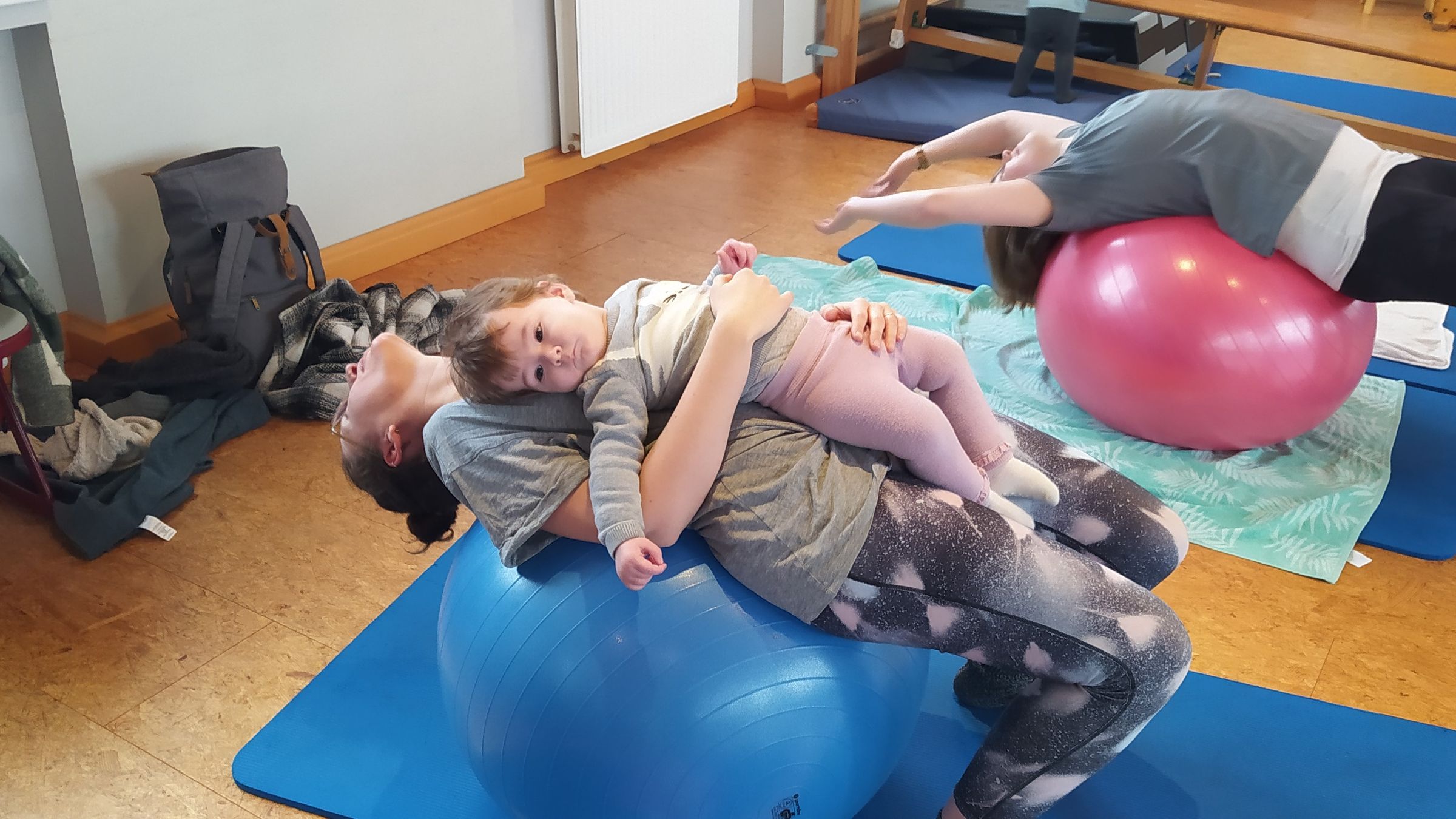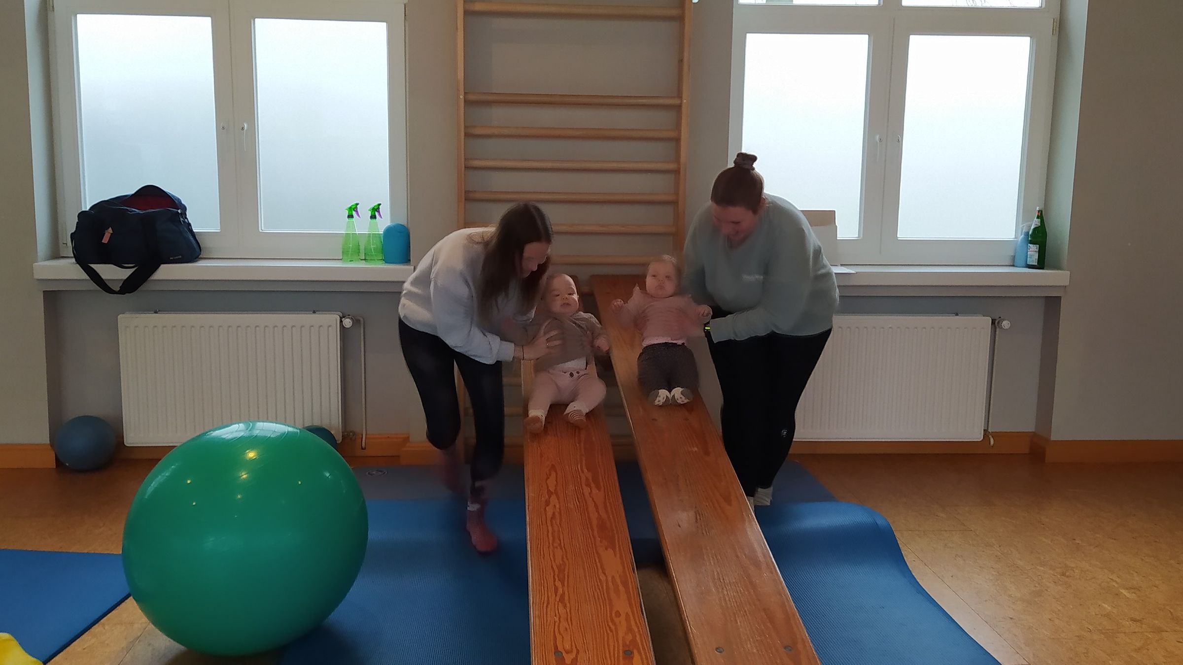 Kurz hab ich überlegt wie es aussehen soll und seit Januar 2023 treffen sich 6 junge Frauen mit Babys bzw. Kleinkindern im Alter von 6 Monaten bis knapp 2 Jahren. Erst wird etwas getan zur Kräftigung der Bauch- und Beckenbodenmuskulatur, um dann den Kindern spielerisch Bewegung und Geschicklichkeit auf Weichbodenmatte, Rutsche und Sitzball zu vermitteln